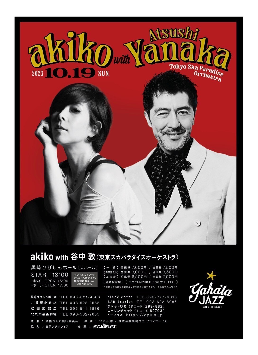■詳細 akiko with 谷中敦 日時:2025年10月19日(日) 場所:黒崎ひびしんホール 時間 ・ホワイエ OPEN/16:00 ・ホールOPEN/17:00 ・START/18:00