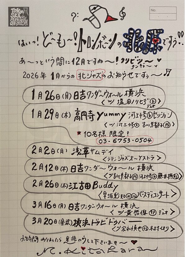 LIVE 2026.03.16[Mon] Tweet 【北原出演】北ジャズ@日吉ワンダーウォール横浜 〇with 黄啓傑 デュオ 日時:2026年3月16日(月) 場所:日吉ワンダーウォール横浜 https://wonderwall-yokohama.jp/ back LATEST LIVE TOUR 2025.05.31[Sat]〜2026.02.28[Sat] 東京スカパラダイスオーケストラ 47都道府県 HALL TOUR「47」 LIVE / EVENT 2026.03.22 [Sun] UPDATE 【谷中・沖出演】ROOTS66 -NEW BEGINNING 60-@大阪城ホール 2026.03.20 [Fri] UPDATE 【谷中・沖出演】ROOTS66 -NEW BEGINNING 60-@東京ガーデンシアター