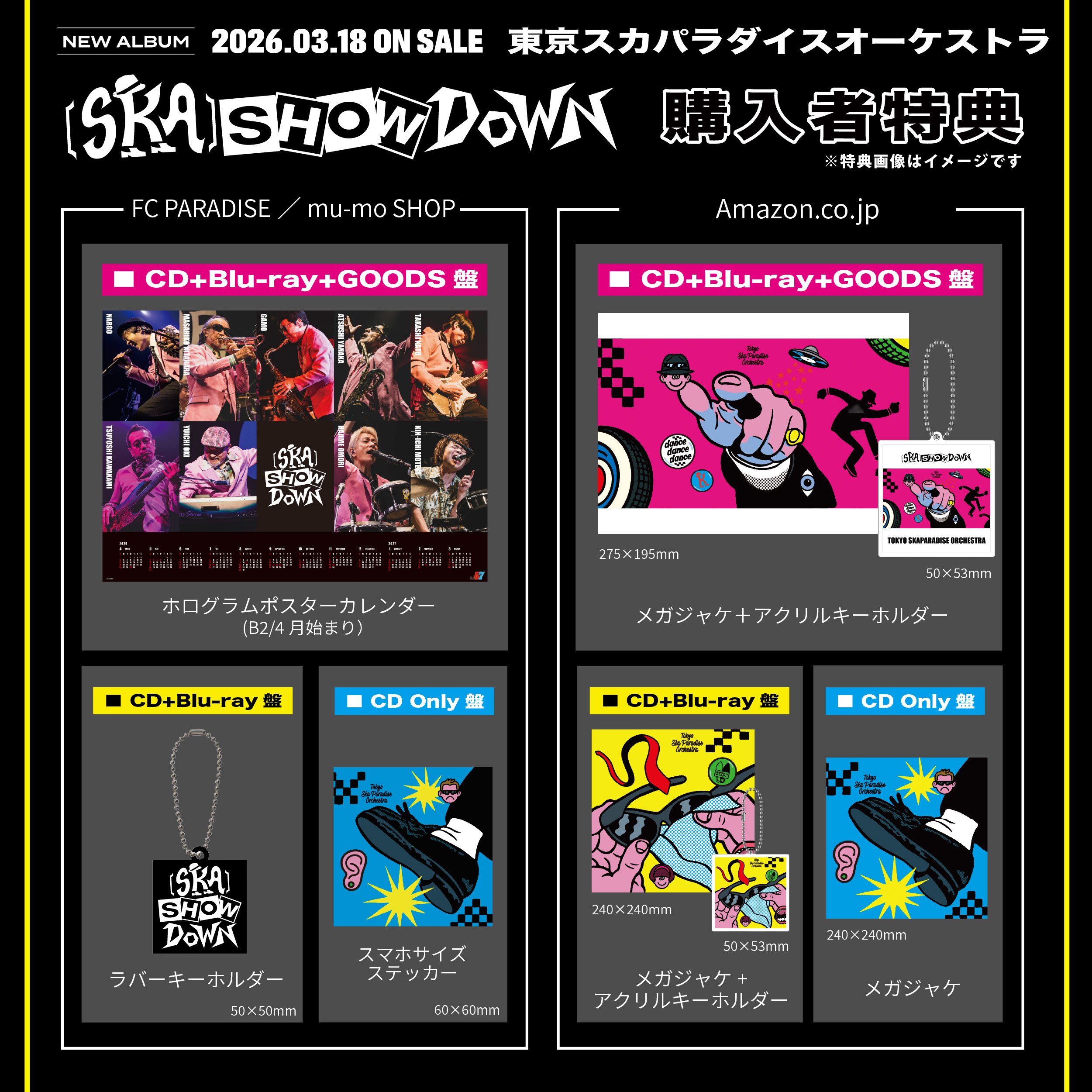 FC PARADISE会員サイトより、3月18日(水)発売のアルバム「[SKA]SHOWDOWN」の下記対象商品をご予約いただくと、