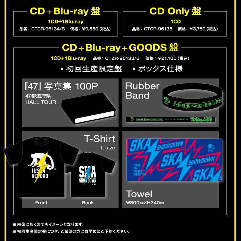 ライブ定番グッズ3点セットの絵柄も解禁されており、“[SKA]SHOWDOWN”のタイトルを稲妻に象った、ライブ感あふれるクールなデザインに仕上がっている。初回生産限定盤となっているため、気になる方はぜひお早めにご予約ください!